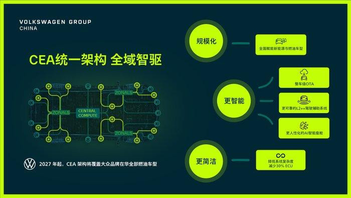 根据最新的消息,CEA架构除了会支持大众在华研发的纯电动车型之外,还会拓展应用至在华生产的燃油及混合动力车型,可以说真正让大众在华的产品体系实现“油电同智”。